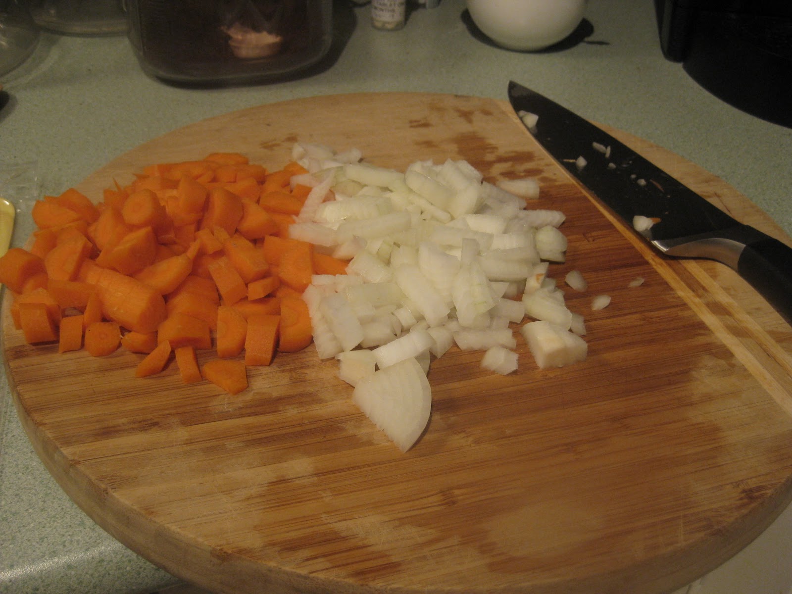 In a large saucepan over medium heat, cook onions, carrots and bacon until onions are tender and translucent and bacon is thoroughly cooked but not crispy. About 5-10 minutes.